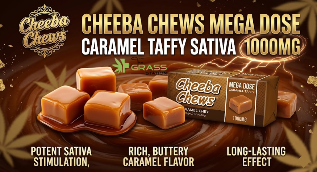 Experience the potency of Cheeba Chews Mega Dose 1000mg Sativa Caramel Taffy at The Grass Station. High-potency, lab-tested, and consistently delicious.